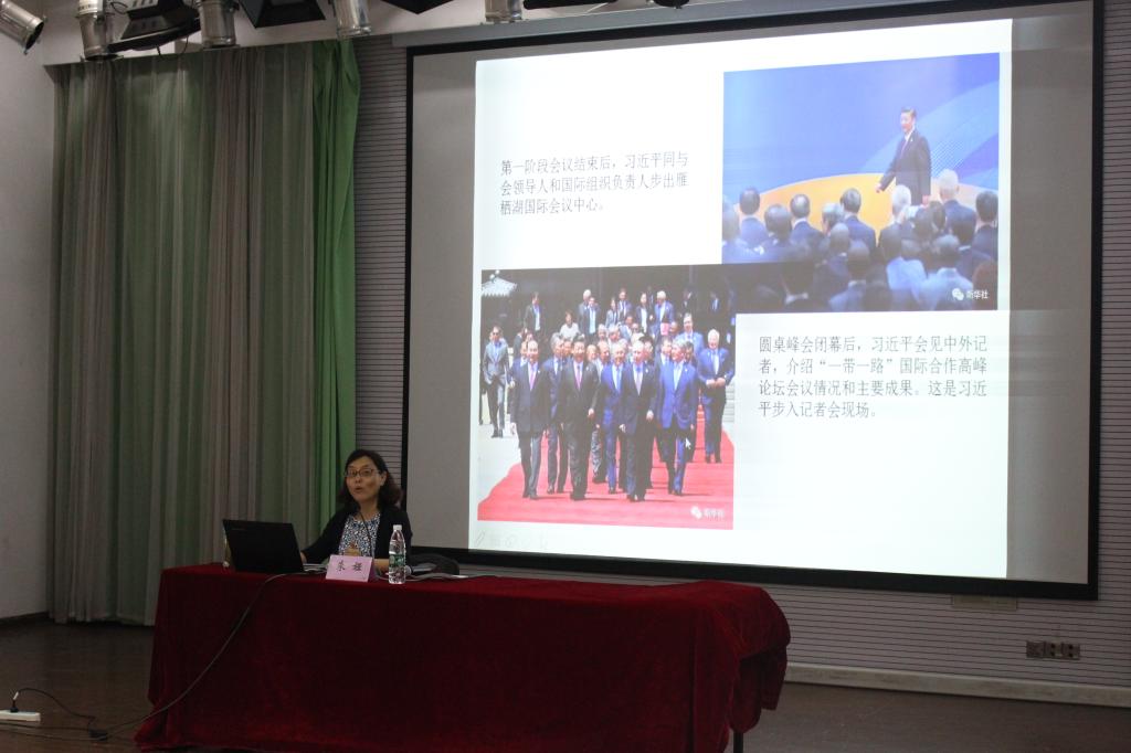 朱娅老师先为同学们介绍了今年5月14日到15日召开的中国“一带一路”国际高峰论坛圆桌峰会。共有30多位国家元首和首脑、100多国家代表参加会议,习近平总书记强调说:“一带一路成员国乘势而上,顺势而为, 共同应对国际经济当前挑战,迈向更好的发展。”接下来朱娅老师为同学们讲解了历史基础、经济背景、政治背景,并分析了一带一路给中国带来的利益与风险。
