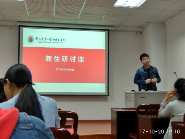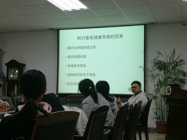 会议室开始了动医院新生研讨课第四课,庾庆华老师和同学们坐在一起,亲切的询问着同学们对于动物医学方面的学习的问题,并耐心详细地为大家讲解。庾庆华老师为同学们讲述了动物健康养殖和肠道益生菌的研发方面的知识,整个过程气氛轻松愉快,师生互动频繁,这堂课使同学们对动物养殖有了更深的了解,受益匪浅。课程虽短,相信同学们在与庾老师热切的探讨中也收获了很多知识。