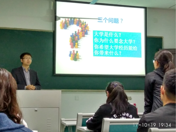 辅导员徐刚老师以一个学长的身份,从学习,大学生活,恋爱以及学生工作四个方面与大家进行了交流。首先他强调学习在大学生活中是最重要的,任何时候应该以学习为主,指出要学有方向,学有所长,强调期末复习以及平时作业的重要性。在大学生活方面,徐刚老师分享了自己在大学做过的兼职经历以及自己做志愿者时候的辛酸。最后老师讲了自己所做的学生工作,通过自己大学所从事的学生工作,鼓励大家要为自己的选择努力,同时积极的承担自己的责任。无论做什么都要坚定目标,不忘初心。