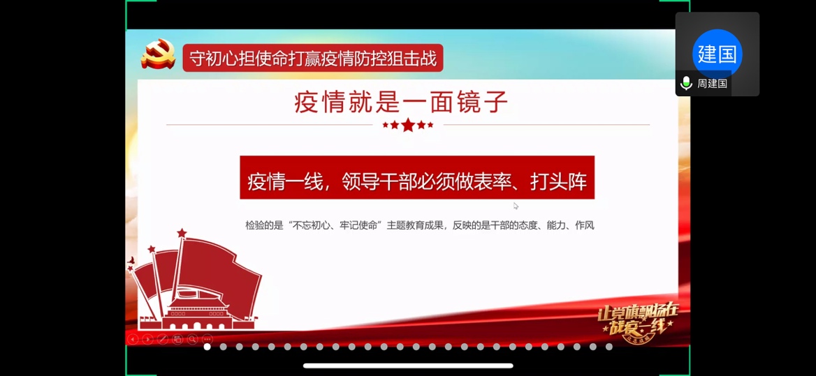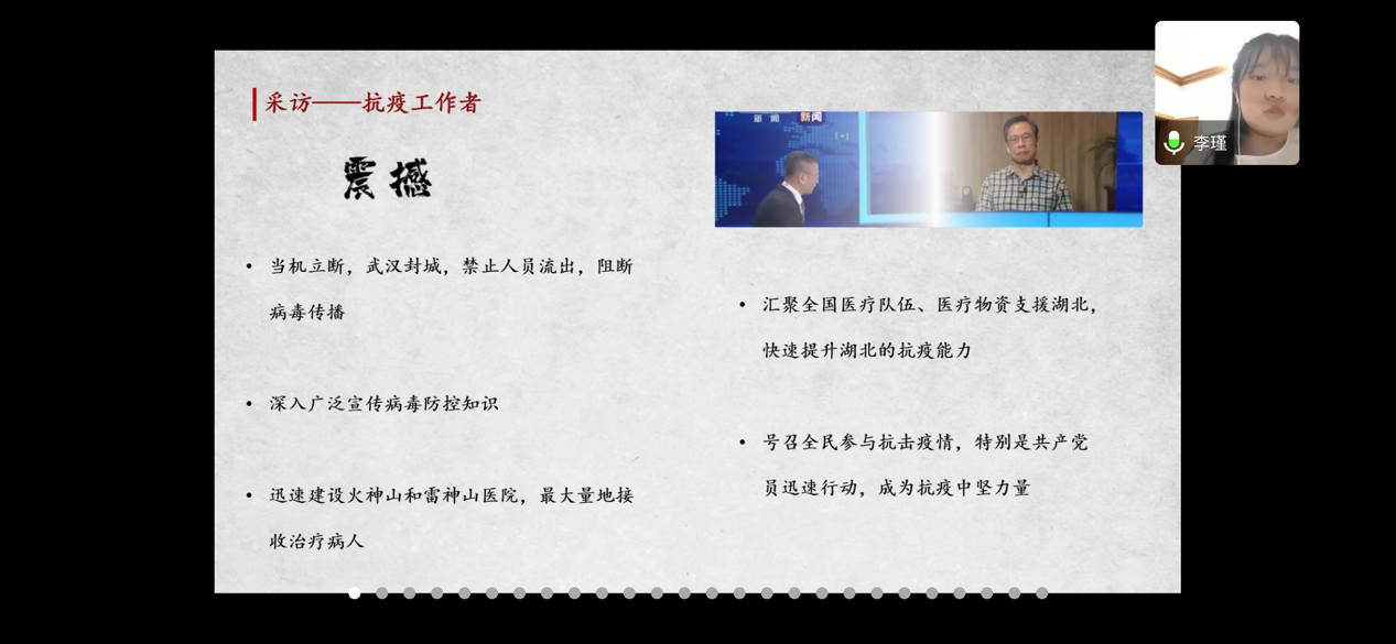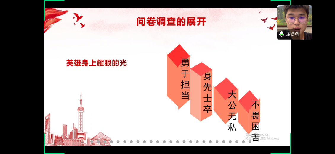 6月2日晚上18:00时许,WilliamHill官网“用青春战‘疫’,为党旗增辉”读懂中国系列活动在线上进行最后的展示。本活动以“抗击疫情”为主题,分成影片观赏和调查采访两个部分。初级党建班同学被分为12组,通过前期观看影片记录感受、分发调查问卷、线上线下采访,最终进行线上分享会,为全体师生上了一堂别出心裁的党课。