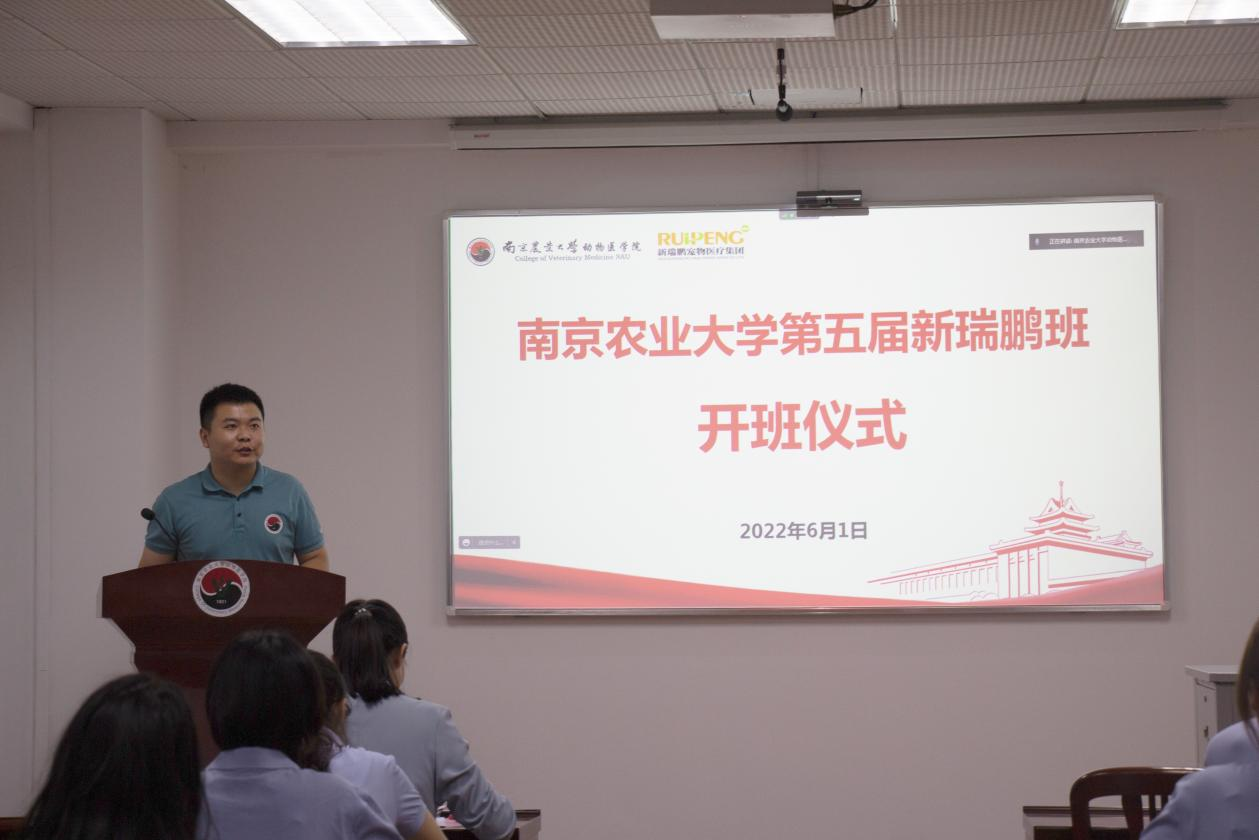 接着,张伟东讲话,对第五届“新瑞鹏班”同学的到来表示欢迎,并讲述了新瑞鹏多年来的创业经历和现在新瑞鹏的雄厚实力。张伟东说在南农动医院举办新瑞鹏班有得天独厚的优势,学生们能在william威廉中文官网打下深厚的理论基础,在新瑞鹏集团所开的宠物医院丰富中自己的临床实践经历。也表示期待学生们能巩固自己的知识,尽快成长,为宠物医疗行业做出更多贡献。