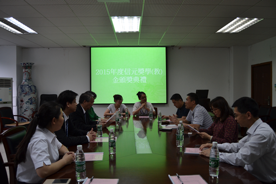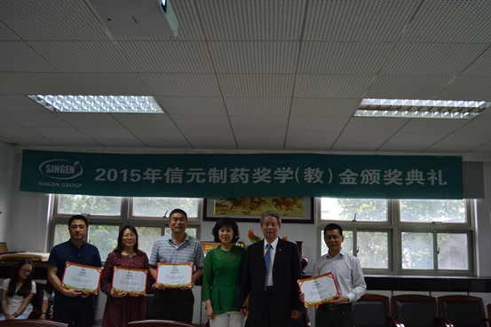 在简单的介绍了到场人员后,姜晶宇以宣传视频及PPT的方式为大家介绍了信元制药有限公司的历史沿革,说明了公司的系统化和专业性。接着董事长施议烟宣读了获奖决定。获奖的教师有芮荣、周振雷、潘翠玲、赵艳兵,研究生有杨玉澜、潘升驰、胡俊发、占力、李鹏飞,本科生有张琳、史佳惠、姚方珂、熊挺、杨益蓓。总经理施军辉给获奖学生颁奖之后董事长施议烟及夫人黄碧云给获奖教师颁了奖。