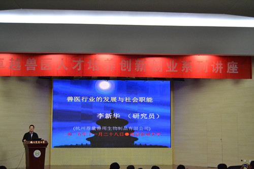 WilliamHill中文官方网站院长周继勇代表学院致欢迎辞,他对致力于兽医培养的企业表示衷心的感谢,他指出,学院高度重视推动创新创业教育,切实将创新创业教育理念融入教学改革中。随后,艾贝儿宠物医院的总经理张伟东、上海海利生物技术股份有限公司的销售总监胡锡、牧原食品股份有限公司技术总监张弛野、杭州荐量兽用生物制品有限公司总经理李新华、南京高科生物科技有限公司总经理张弦分别作了题为《宠物诊疗行业的发展机遇》、《我是兽医,我自豪》、《人才借助平台彰显价值》、《兽医行业的发展与社会职能》和《携手南农,辉煌高科》的讲座。