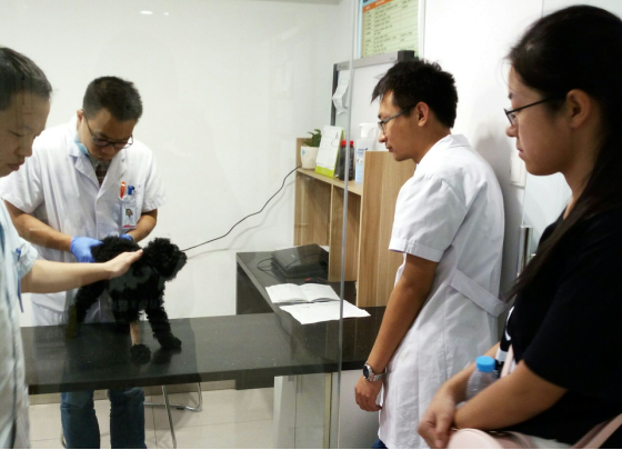 同学旁观医生对宠物进行基本检查。