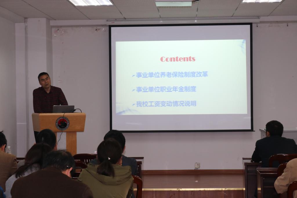 副处长周振雷作了题为《养老保险制度改革及工资说明》报告。从事业单位养老保险制度改革、事业单位职业年金制度、工资变动情况说明三个方面做了详解。