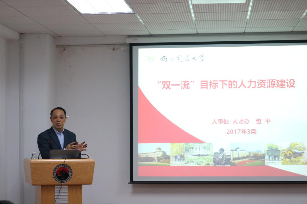 人事处处长、人才办主任包平作了题为《“双一流”目标下的人力资源建设》报告。包平从国家“双一流”建设新任务谈起,分析了高校“双一流”建设的内涵、建设和改革的任务,指出高校应以“一流为目标、学科为基础、绩效为杠杆、改革为动力”加快建设步伐。重点围绕聘任、考核、分配等三类核心问题和“双一流”学科建设的目标和任务,对人才和师资队伍建设情况和未来规划作了重点阐释。