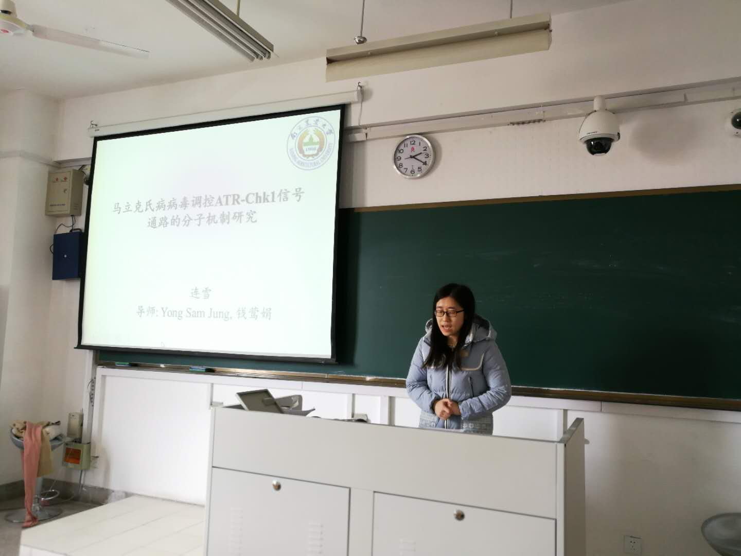 最后一位是博士生陈欢,她的题目是《宿主蛋白HDAC6在A型流感病毒感染过程中的作用和机理的研究》。她的课题主要研究了人蛋白HDAC6与IAV的互作机理,细节丰富,实验严谨,得到了老师的肯定。