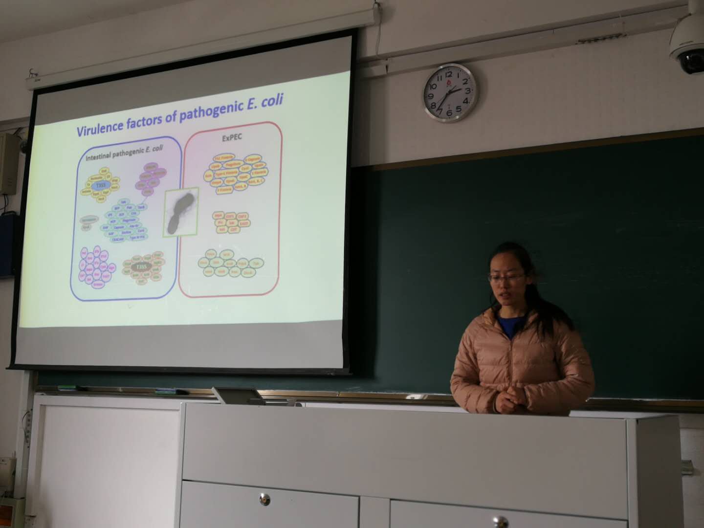 第三位是博士生江丰伟,她的题目是《全局调控因子AcrA和FNR对致病性大肠杆菌致病机理的研究》。主要探究了AcrA可以控制肠外致病性大肠杆菌ExPEC的代谢、趋化性和运动性,促进了它的毒力,决定了ExPEC的致病性。FNR与AcrA作用相似。而AcrA和FNR还可以直接调控柠檬酸发酵基因的表达,并通过直接调控citA/citB系统间接影响柠檬酸发酵基因的表达。