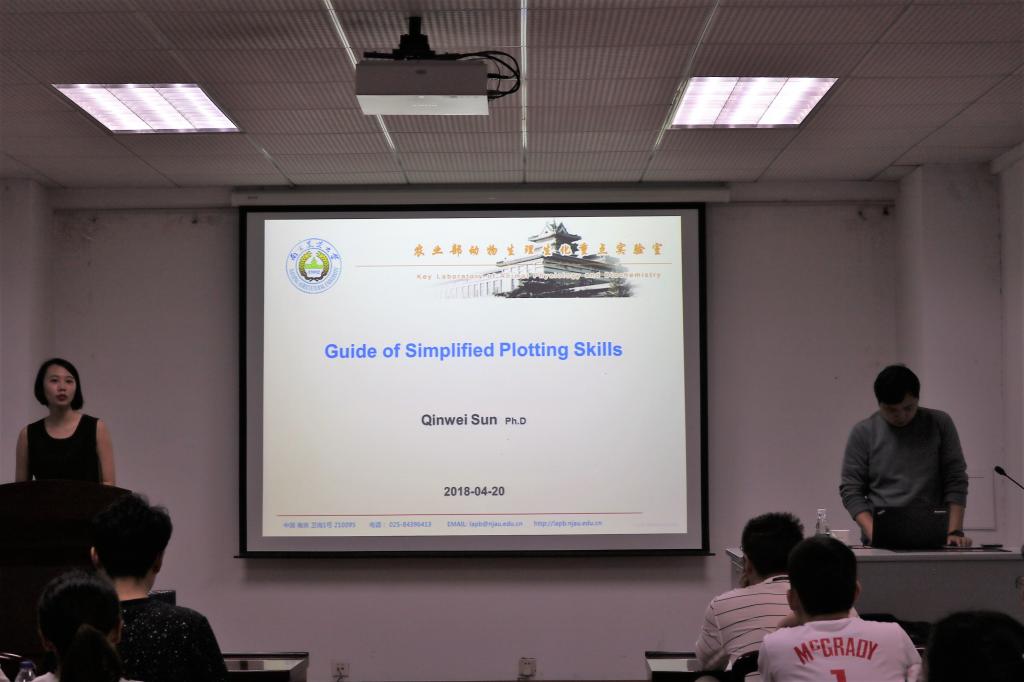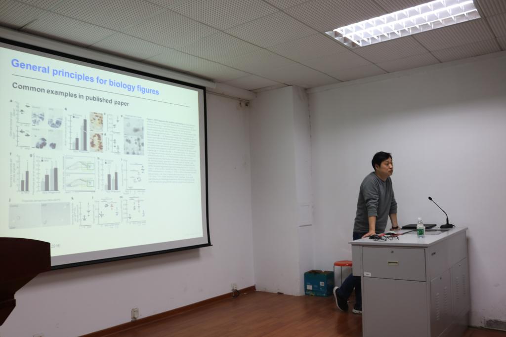 接下来进行详细的讲解,本次讲座内容主要分为两个部分。在第一部分中,孙钦伟分享了有关科技论文绘图需要注意的基本元素构成:dpi; image size; image format; color art; compression; color depth,并且强调在投稿前一定要仔细阅读所发期刊的figure policies。之后他又重点介绍了科技论文绘图的五种基本配色原则,并一一进行举例讲解。这部分内容着重介绍了科技论文绘图的基础理论。在第二部分中,他分享了科技论文绘图过程中可以利用的几类重要软件,并重点讲解了ScienceSlides; Graphpad; EDraw; Photoshop以及R语言在绘图当中的妙用,不时赢得阵阵惊叹。在座的学生与主讲人积极互动,营造了良好的交流氛围。