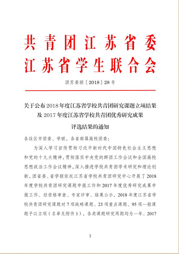据悉江苏省学校共青团研究成果评选工作由共青团江苏省委牵头组织实施,旨在深入学习宣传贯彻习近平新时代中国特色社会主义思想和党的十九大精神,贯彻落实中央党的群团工作会议和全国高校思想政治工作会议精神,深入推进学校共青团学术研究和理论创新。评选面向江苏全体高校,每年开展一次。