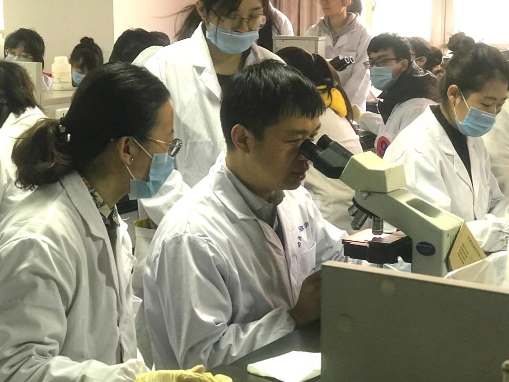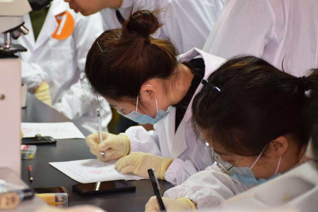 病原菌的检查主要考察病料的采取,触片的制作,染色方法和显微镜的使用,通过了解学生对临床疾病诊断的基本技能的掌握程度,对参赛选手进行相关评审以及错误的纠正。姚火春教授表示,“大家的赛前训练还是有效果的,这一届选手们的速度和质量都有所提升,但还是存在着一些问题,微生物实验最重要的就是无菌操作,任何一个小的细节都不可以松懈。”