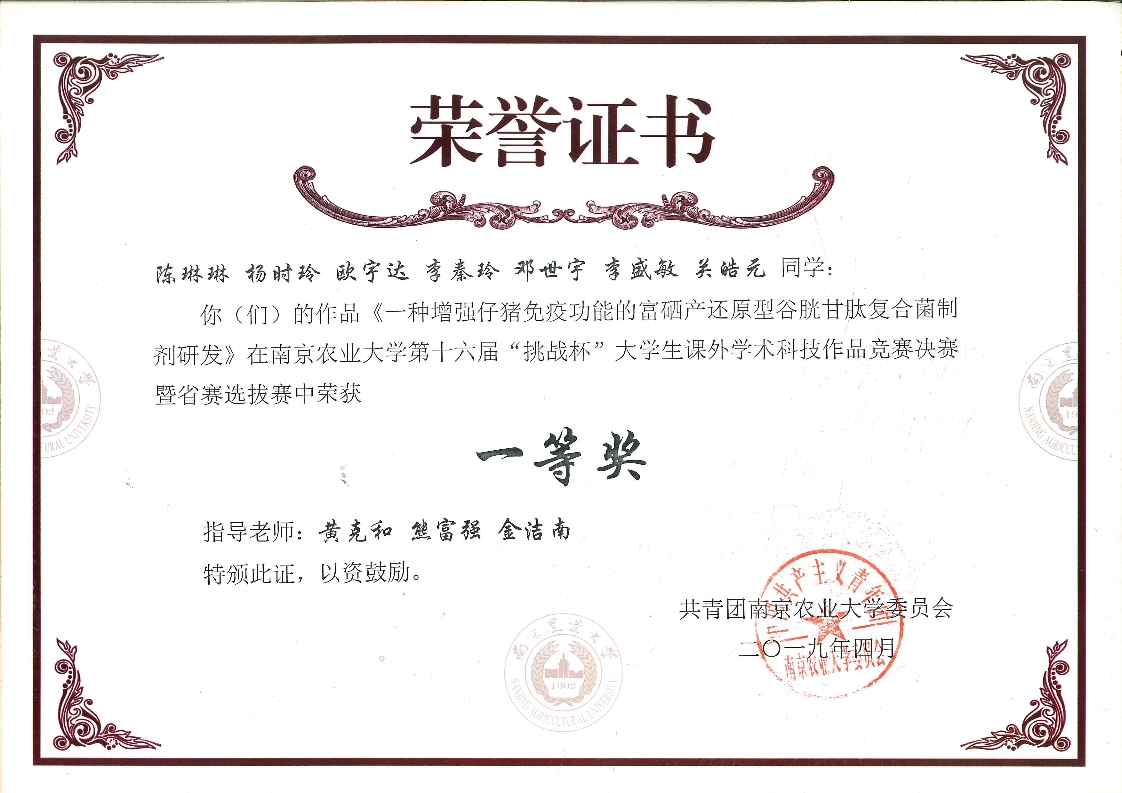 此外,《新发D型流感病毒的病原学与流行病学研究》、《污染饲料中HT-2毒素对早期胚胎的毒性影响及应对策略》、《一种增强仔猪免疫功能的富硒产还原型谷胱甘肽复合菌制剂研发》三个项目成功进入省赛,将于5月24日-26日参加江苏省省赛决赛。