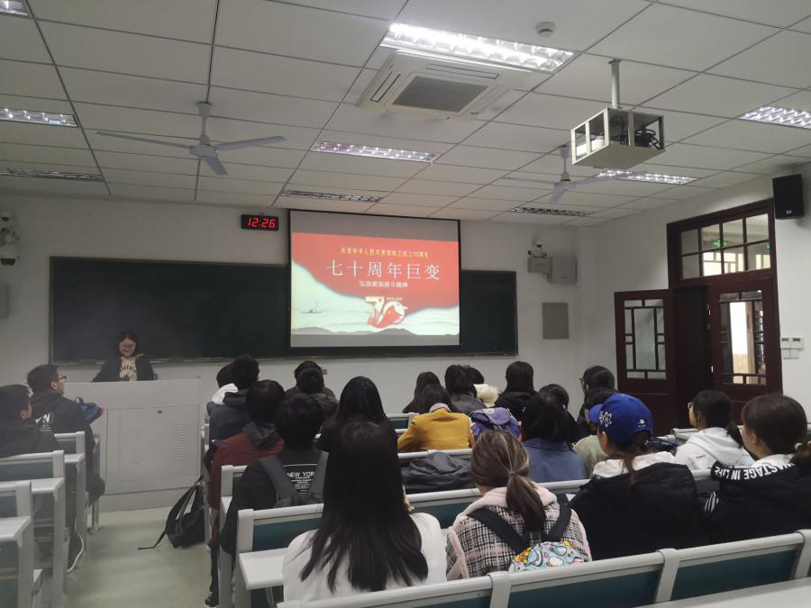 (图一:动医184班进行“献礼新中国成立七十周年”—感受七十年间的变化主题团日活动)