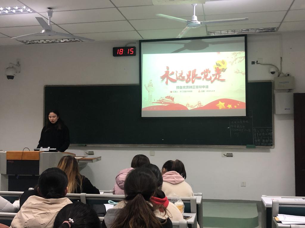 会议第二项议程:进行预备党员转正答辩。提交转正申请的9位预备党员分别从思想、学习、工作、生活等方面汇报了在一年预备期的表现,支部成员进行了提问答辩。经支部讨论,投票表决,一致同意通过樊昕怡等九位同志的转正答辩。