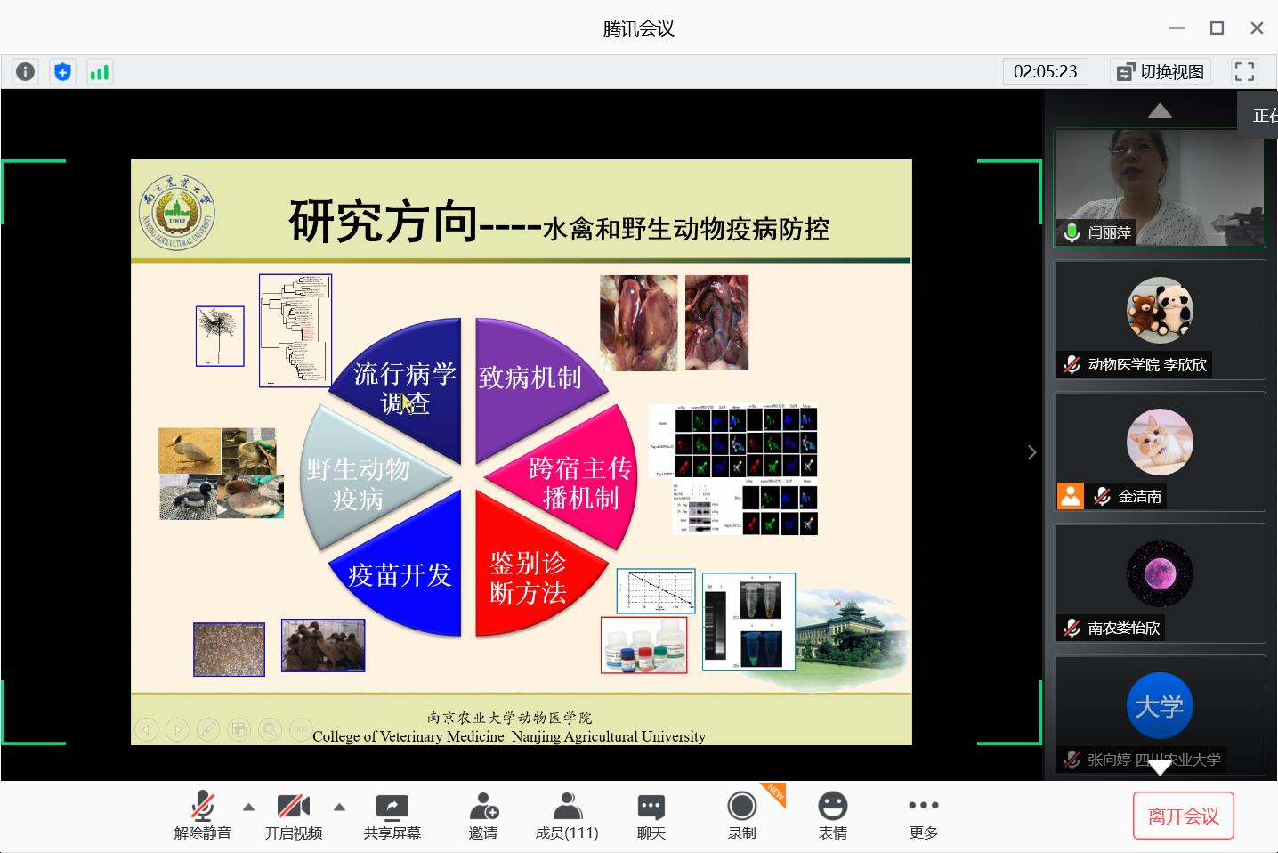 随后,预防兽医方向平继辉、闫丽萍、汤芳三位老师详细介绍了预防兽医学系部分课题组情况,包括:流感病毒、动物传染病、人兽共患病病原微生物学等研究课题组;