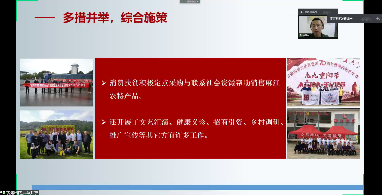 最后,任职四川省米易县得石镇马鹿寨彝族村第一书记的汪扬力同志进行了“用心用情工作,推动全面小康”的主题报告。汪书记先是介绍了马鹿寨村边远、崎岖的地理条件,同时强调了马鹿寨村以彝为主,彝汉杂居的人口分布特点;随后从党建引领、开展文化活动、改善民生、促进产业发展几个方面对该村脱贫攻坚、乡村振兴工作进行了详述。汪书记播放的马鹿寨风光宣传片,更是让同学们深刻意识到了该地开展脱贫攻坚、乡村振兴工作的必要性和紧迫性。