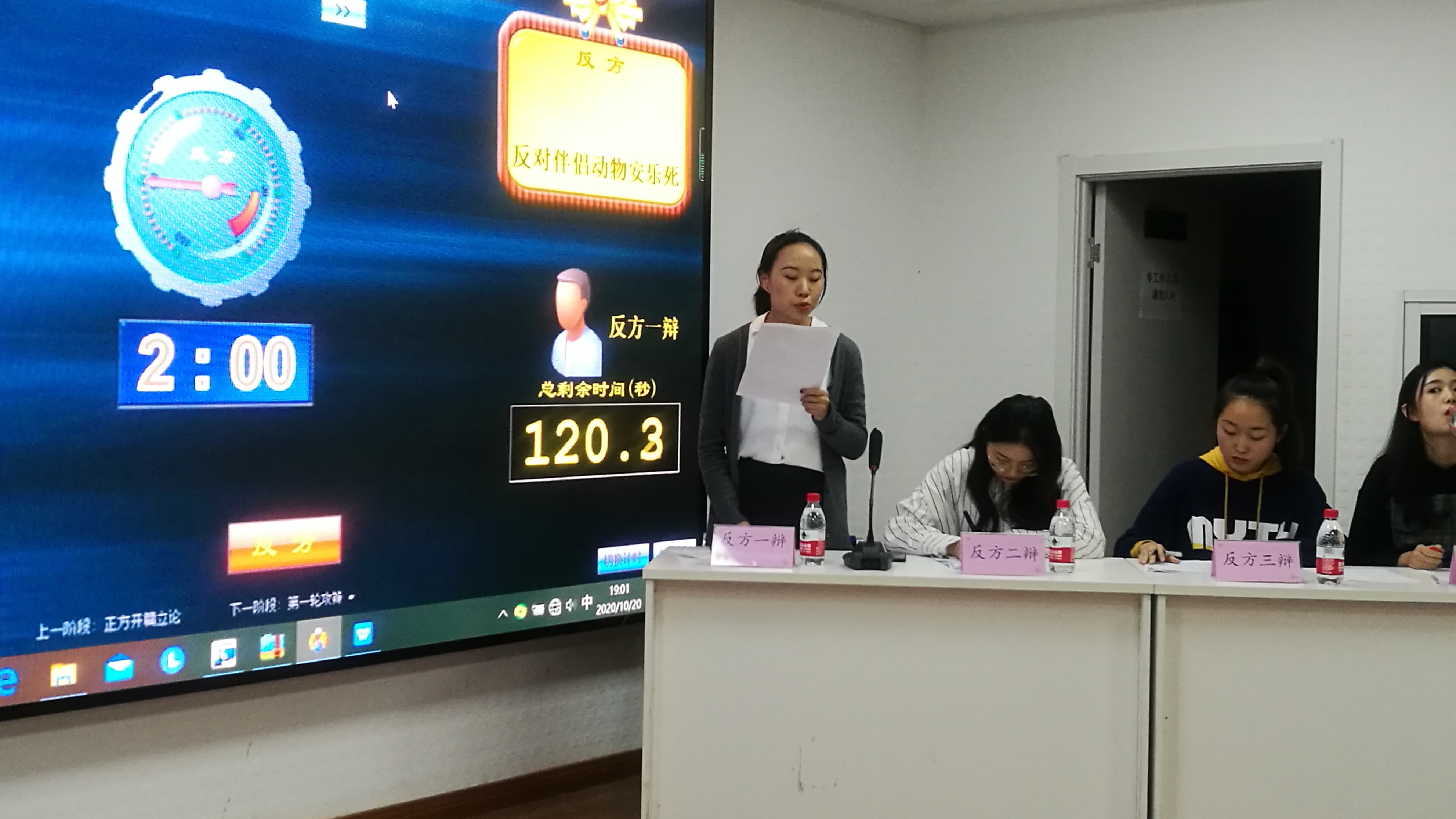 在主持人简短介绍了本场比赛的赛制、规则后,比赛拉开帷幕。首先是开篇立论环节,正方一辩陈述己方“支持伴侣动物安乐死”的观点,主要从动物、主人和社会价值三个方面进行立论:安乐死能减少病重动物的痛苦,缓解病宠主人精神和经济上的压力,减少社会上流浪动物泛滥的现象。接着反方一辩围绕“反对伴侣动物安乐死”的观点,从安乐死的运用范围过广,安乐死的认定具有不确定性,主人的道德素质不能为安乐死提供伦理保障,安乐死的过程存在痛苦这四个方面做了阐述。