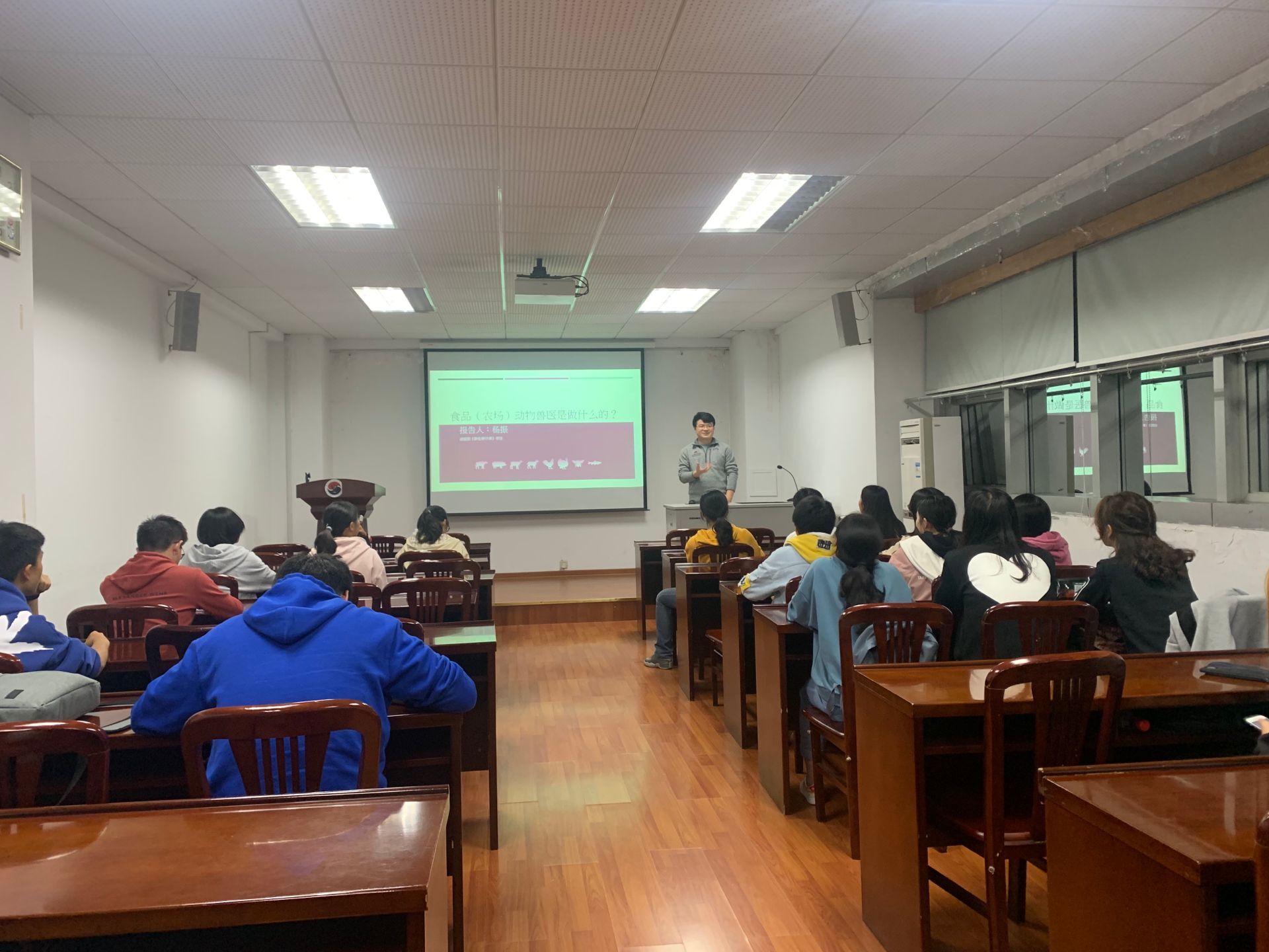 11月6日,杨振老师于逸夫楼3044举行的以“食品(农场)动物兽医是做什么的?”为主题的新生教育课获得圆满成功。杨老师以美国为例讲述了畜牧养殖的变化、食品动物健康管理演变等,并向同学们介绍食品动物兽医的能力和技能要求及需求。杨老师不仅仅在课上精心为同学们讲解与该节课相关内容,还在课下对同学们的踊跃提问耐心地回复,解答了同学们有关将来规划、出国留学相关准备之类的问题,让同学们受益匪浅,对自己在大学的学习有了更加清晰的目标。