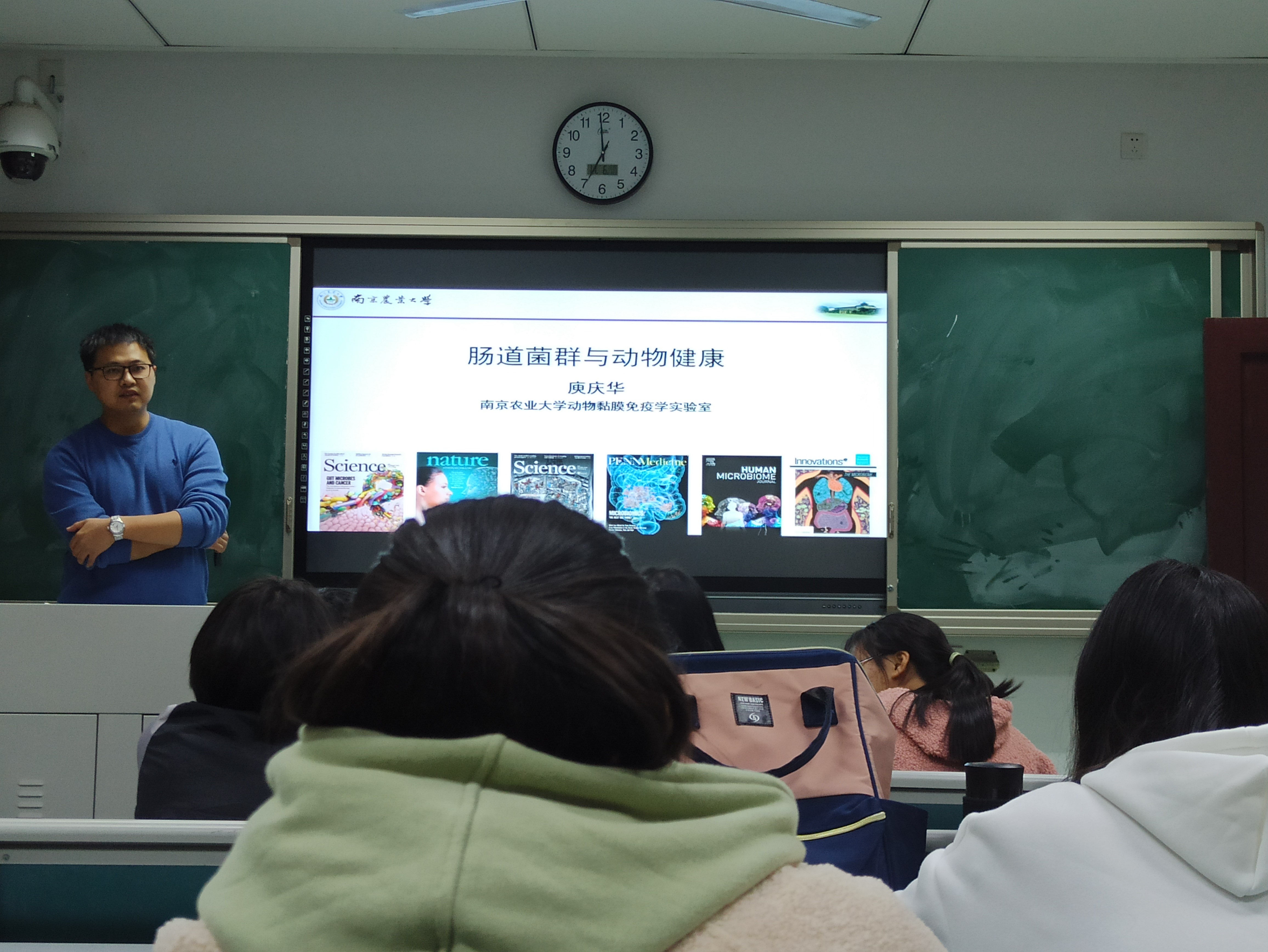 11月6日晚在主楼225庾庆华老师给新生针对肠道菌群这个热点前沿话题开展了一次研讨课。庾老师首先向我们介绍了肠道菌群,给我们科普了人和宠物住一起久了,肠道菌群的相似度会有所提高提高这个知识,跟同学们开玩笑说如果狗丢了可以先做一个检查来检测是不是自己家的宠物