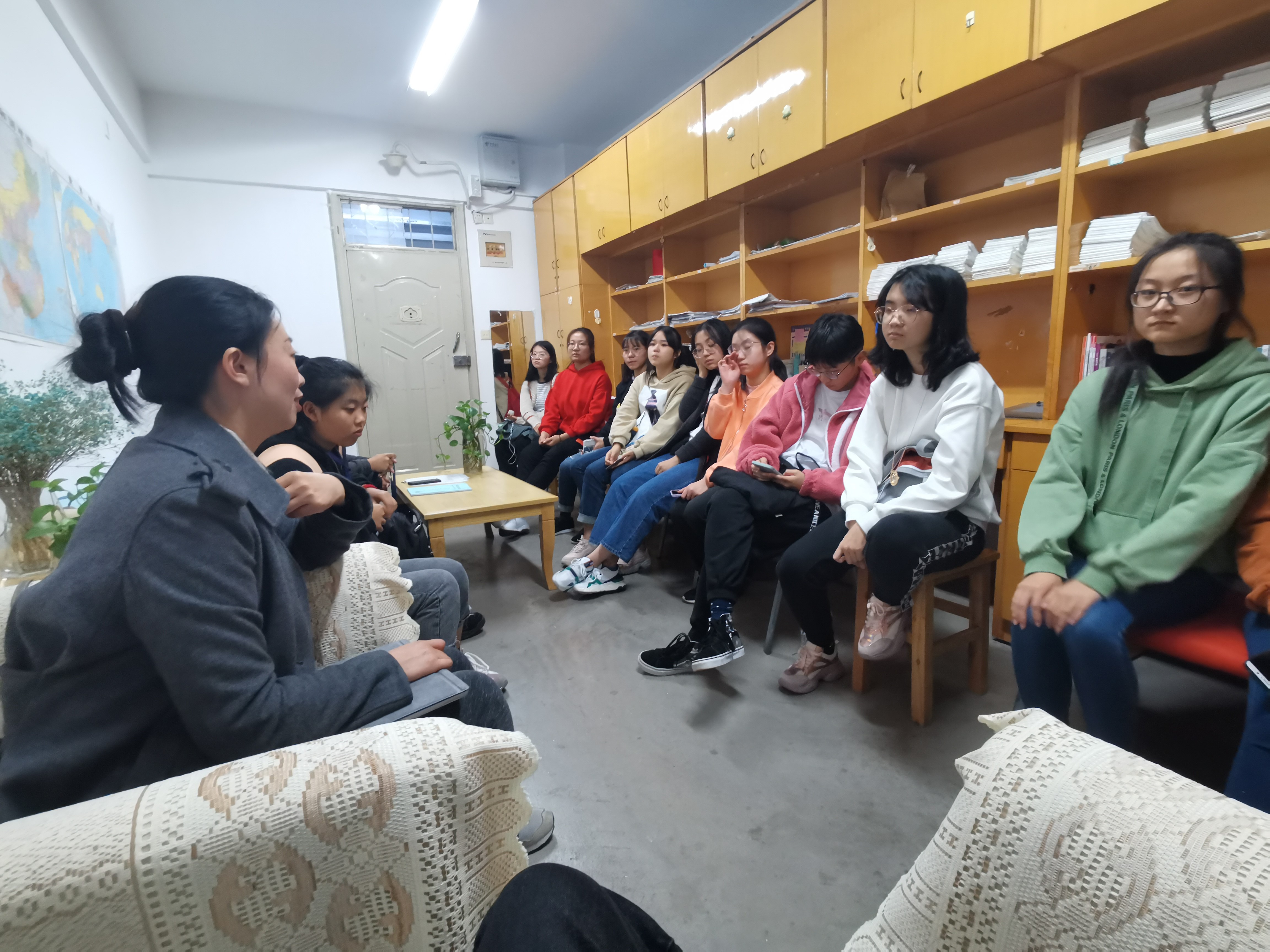 11月4日在13舍辅导员工作室,刘照云老师在这样不一样的地方给新生们开了一堂名为“认识你自己”的研讨课。老师首先让每个人自我介绍,然后向同学们提问刚刚介绍过的内容,由此引出了如何让大家在自我介绍时记住自己,老师让我们大家首先要清楚的认识自己,教会我们如何把高中的学习生活中得到的习惯更好的应用到大学生活中。