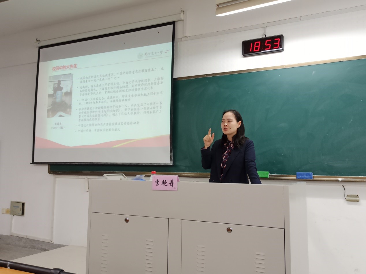 第二部分,李老师向我们介绍了薪火相传的南农魂,包括矢志不渝的爱国情怀、勇攀高峰的科学追求、鞠躬尽瘁的奉献精神。接着,李老师向我们传递了新农人的使命,争做一个优秀的新农人、建设农业特色世界一流大学、助力中华民族的伟大复兴。