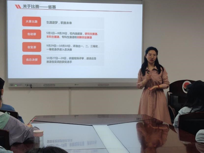 培训会开始,夏丽介绍了本次大赛的主题主旨及初复赛、总决赛的具体流程;同时还详细介绍了几种职业规划的理论模型。