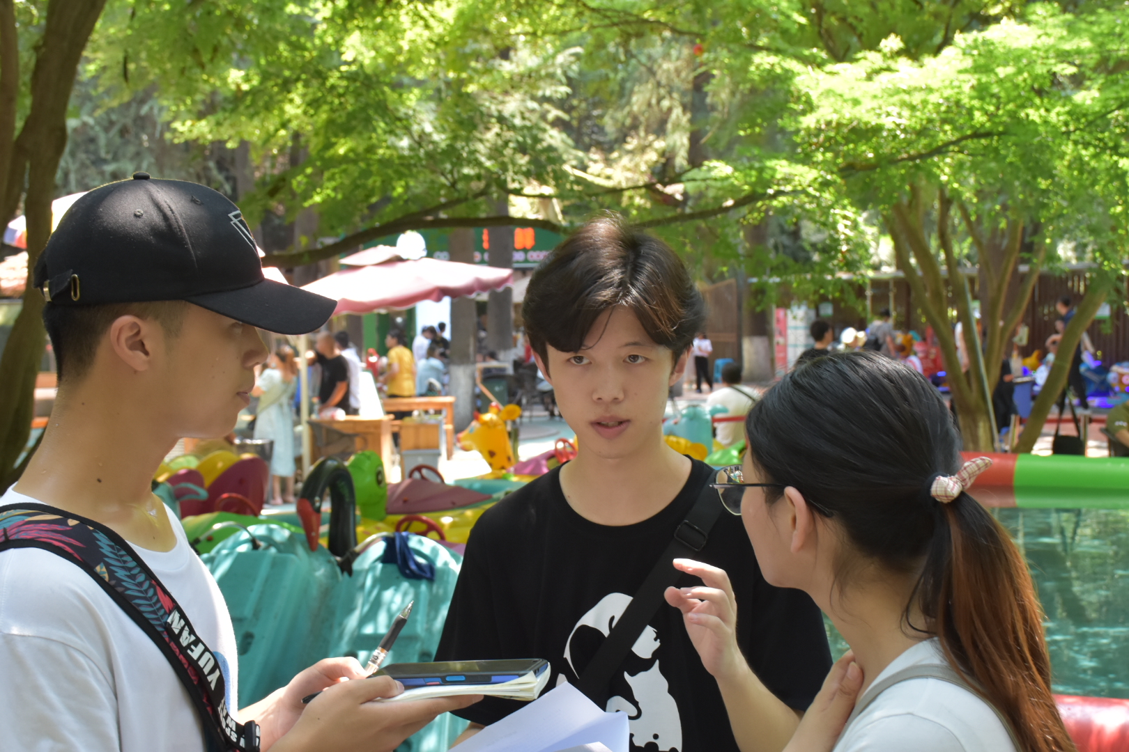 7月13日-14日,团队成员分成六组,分别前往新街口、玄武湖、红山动物园等地进行线下采访,同时也在线上发布了问卷进行搜集与调研。采访和问卷涉及宠物盲盒、动物表演和动物保护等有关内容。活动收集到198份有效线下问卷,259份有效线上问卷,得到了群众的认可和支持。在红山动物园的采访中,游客们表示了对动物表演和动物虐待的反对,也表示遇到虐待动物行为会出手制止。工作人员则提出:动物表演的取消是循序渐进的过程,动物园的建设和改造应贴近自然环境。