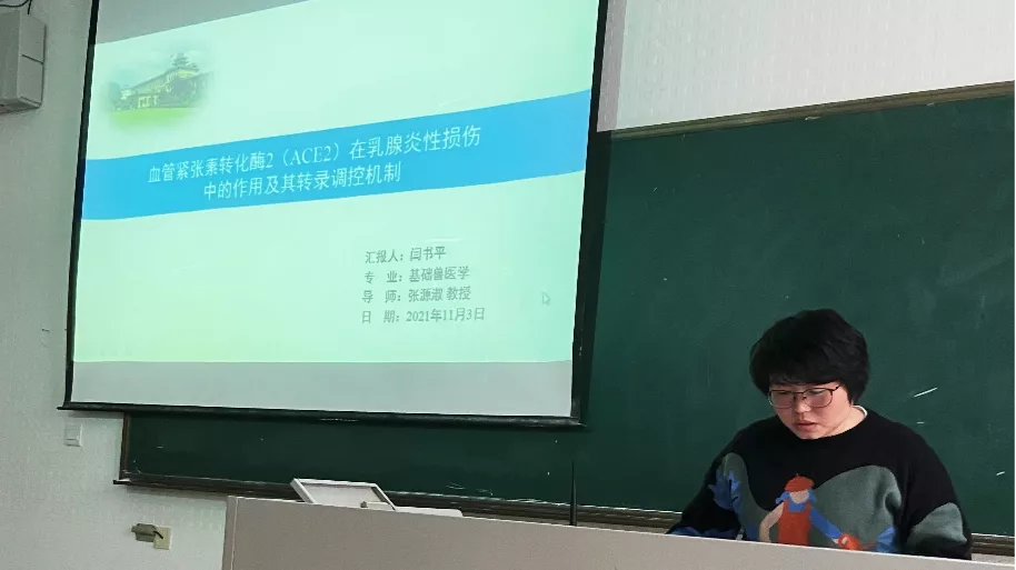 第二位汇报人是来自基础兽医学的博士生闫书平,她汇报的题目是《血管紧张素转化酶2(ACE2)在乳腺炎性损伤中的作用及转录调控机制》。汇报内容主要围绕ACE2的功能机制、ACE2和LPS的相互作用关系等方面进行阐述。她的汇报令在场同学受益良多,也获得了评委老师对其研究内容的肯定。