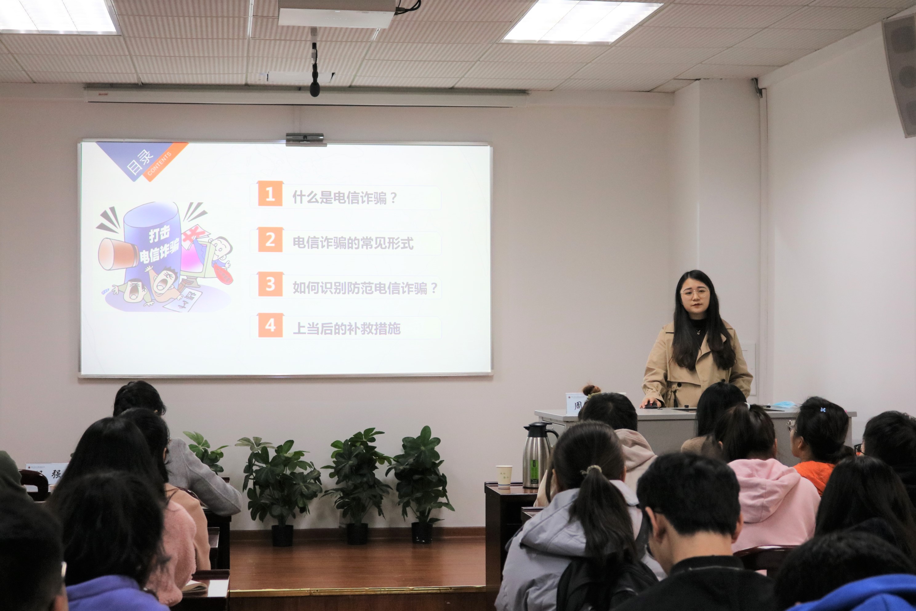 首先,周佳慧详细介绍了电信诈骗的定义、常见形式及其特点,并结合若干典型案例,详细讲解了如何识别电信诈骗,如何防护电信诈骗,建议广大师生下载国家反诈中心APP等,为自己的财产安全增添一层保障。