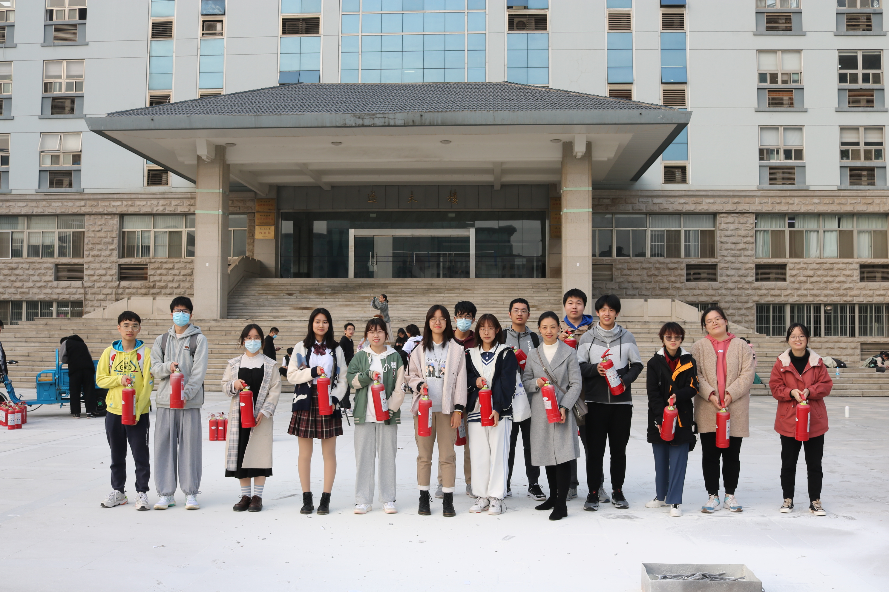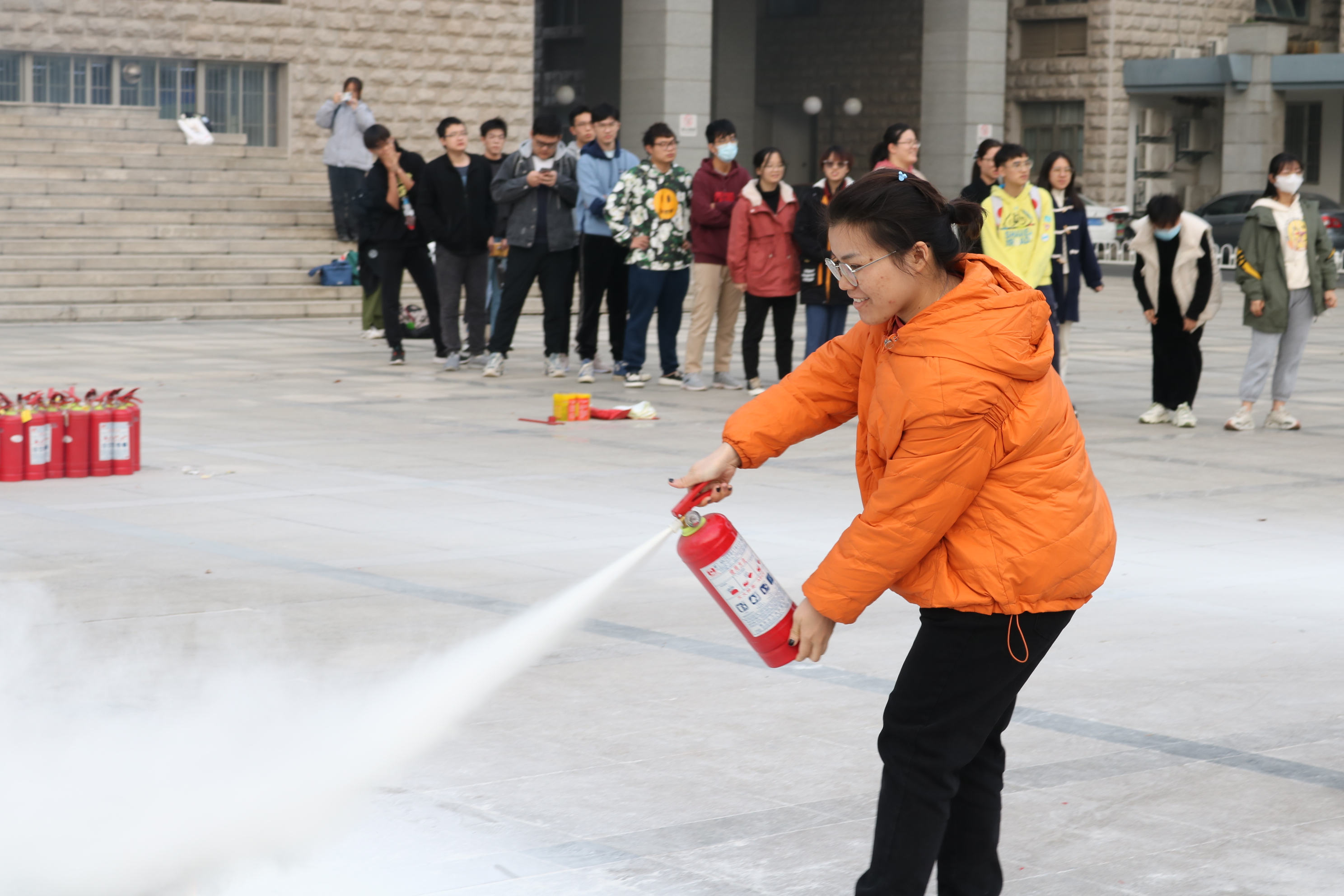 最后,与会师生在逸夫楼南广场进行了灭火工具现场教学,详细了解了灭火器、灭火毯、水枪的使用,增强了紧急应变处理能力。