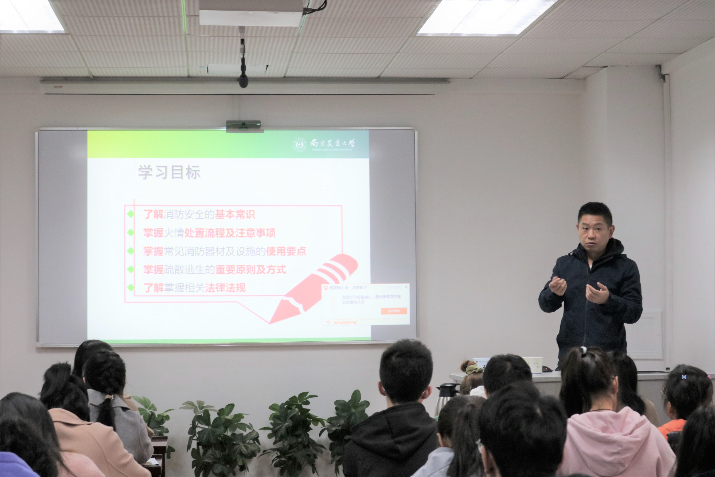 随后,程强从南农实际安全事故出发,讲述了如何预防火灾、遇到火灾如何处理以及逃生技能;并通过火灾案例现场视频,提高同学们对火灾的警惕,增强火灾防范意识。