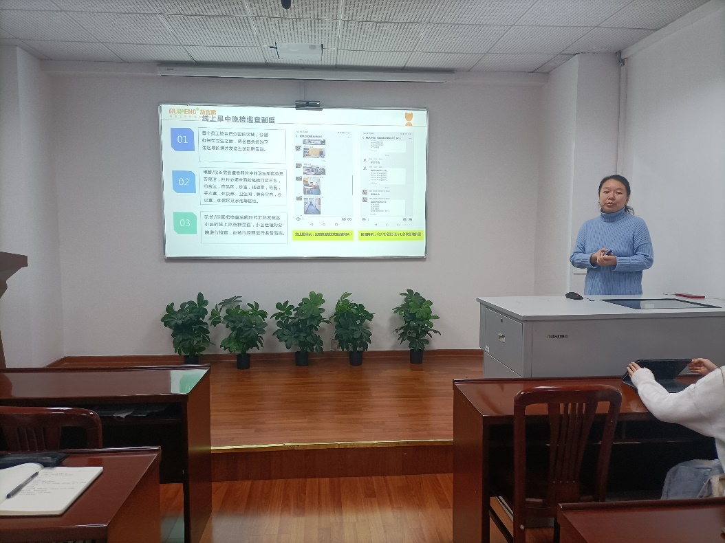 田茹先向同学们讲解了门店的店容店貌需要注意的事项。首先是美容区的打扫,需要做到干净卫生温馨,特别要注意卫生死角。接下来是医疗区的环境重点,她强调了诊疗室、化验室、药房、手术室、中央处置区等区域的管理标准和检查重点。田茹多次强调医疗废物一定要放到规定位置,不可随意丢弃。