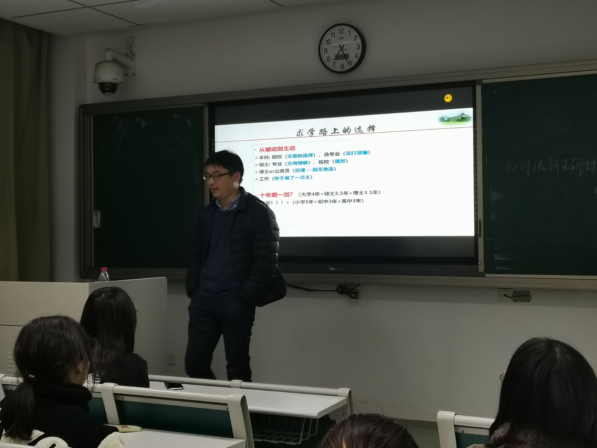 马喆教授以“有关“读研”的一些思考”为题,讲解了“为什么‘读研’这么热” 。之后马喆和同学们讨论了“‘读研’的本质是什么”,马喆认为,研究生的任务就是从事科学研究,解决科学问题。紧接着,马喆让同学们考虑关于读研的一些现实问题,又向同学们讲述了社会的人才需求,让同学们可以更好地思考是否读研。最后,马喆希望同学们以百折不挠地勇气,刻苦钻研的毅力以及孜孜不倦的勇气进行往后的学习。