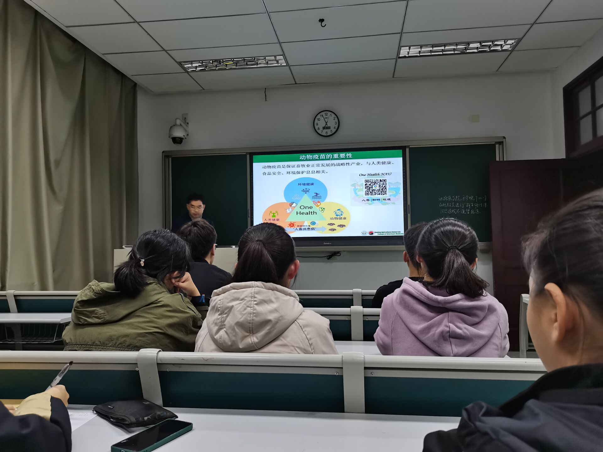 蔺辉星老师围绕 “动物疫苗开发”这一主题,向同学们简单介绍了动物疫苗开发的大环境,从“动物疫苗的重要性”、“动物疫苗的种类”、“动物疫苗的开发流程”和“动物疫苗的发展趋势”四个方面进行了讲解。通过介绍狂犬病的百分百病死率,强调了疫苗预防发病的重要性。最后,蔺辉星再次总结了当下的动物疫苗发展趋势,预防为主来做好生物安全防控。