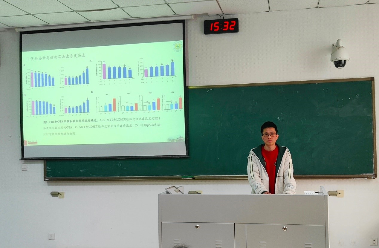 第四位是来自临床兽医学的李好磊,他的题目是《无毒剂量FB1通过ROS介导的JNK/MAPK信号通路加重OTA诱导的细胞凋亡和肾损伤》。该课题主要研究了无毒浓度和低剂量的FB1联合OTA造成细胞凋亡和小鼠肾损伤的机制。不同于其他研究热点,该课题聚焦于少有人研究的毒素,让现场同学受益匪浅。