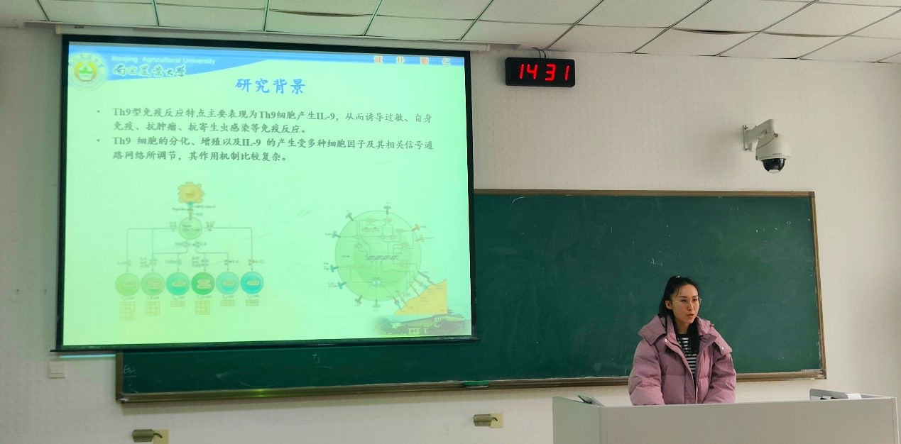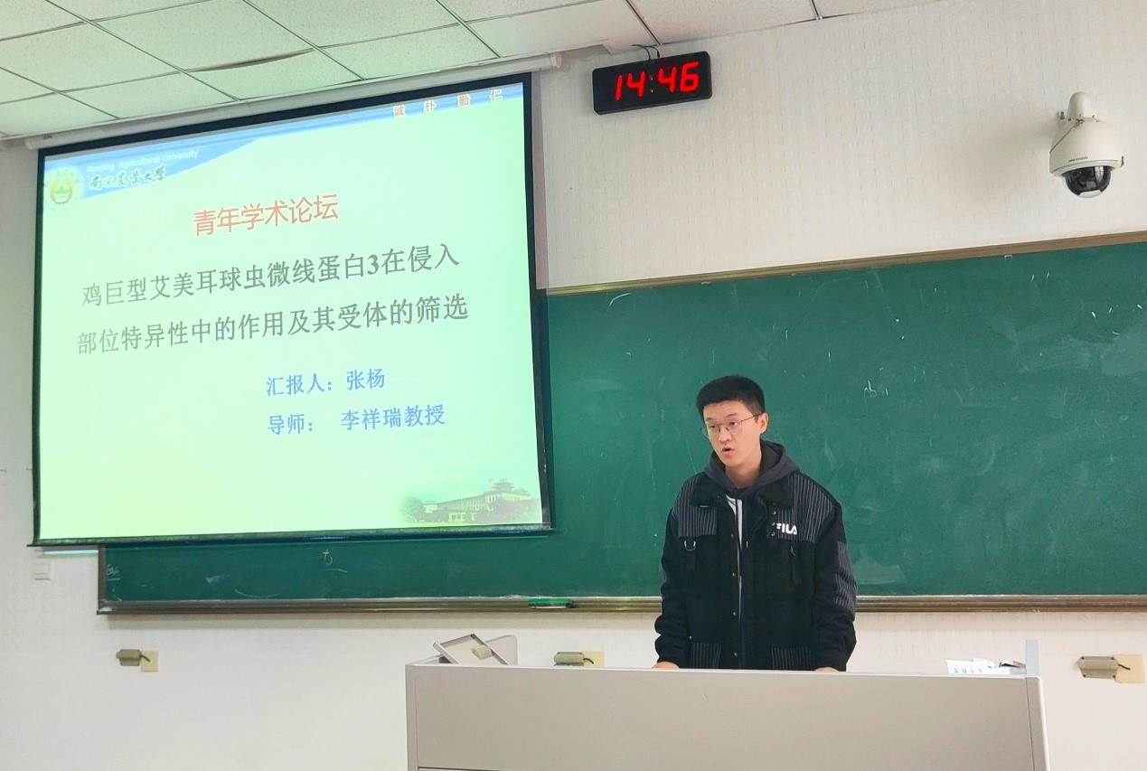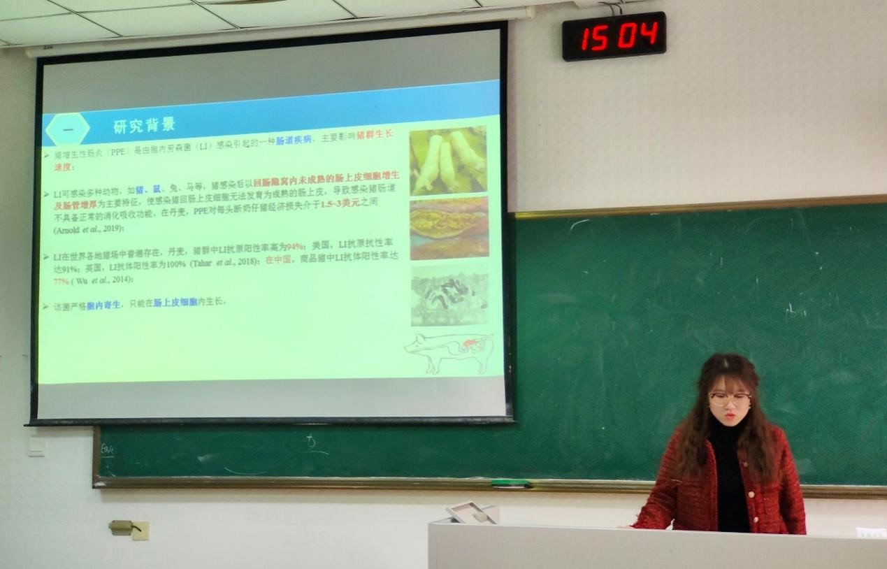 第二位是来自于预防兽医学的张杨,他汇报的题目是《鸡巨型艾美尔球虫微线蛋白3在侵入部位特异性中的作用及其受体的筛选》。该研究着重探究了鸡巨型艾美尔球虫微线蛋白3在侵入部位的特异性作用,以及成功筛选了12个巨型艾美尔球虫微线蛋白3-MAR2受体。老师对其研究成果表示肯定,同时也提出了一些针对后续实验结果的验证思路,令人受益匪浅。