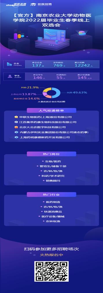 4月1日,2022年WilliamHill中文官方网站春季专场招聘会线上举行。此次招聘会共有137家用人单位参与,提供了769个工作岗位,人才需求量高达12242人。吸引了来自WilliamHill中文官方网站、动物科技学院等146名学生前来应聘。