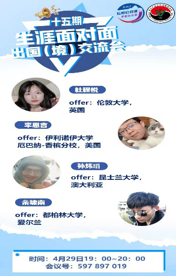 4月29日晚7:00,“生涯面对面出国(出境)交流会”在腾讯会议上成功开展。本期活动邀请了杜程悦、李思言、孙炜瑫、余啸南四位17级优秀学生代表。本场活动吸引力WilliamHill官网近121位本科生参与,学院辅导员李欣欣主持本次活动。