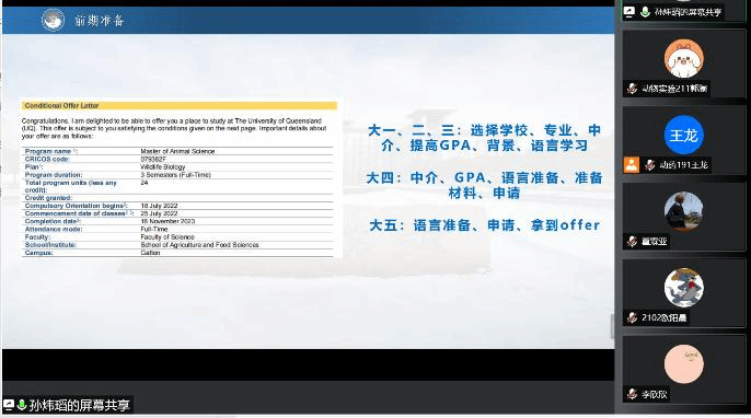 随后就留学时间安排和留学所需资料方面详细介绍自己的申请经验,指出要提前对相关学校进行了解并结合自身实际情况选择不同的方式,一定要提升自己的硬性条件。