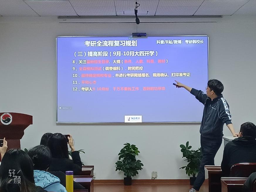 接着,韩校长将考研复习分为四个阶段,基础,强化,提高,冲刺,对每一段复习方式和复习目标讲解,大大提高了同学们的考研复习效率。
