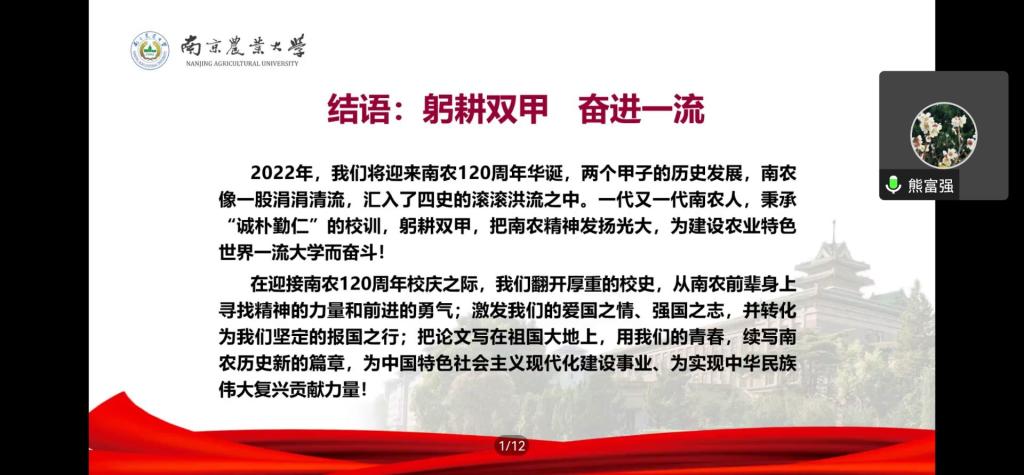 第二部分,熊富强以“超一流的学术成果”为题,呼吁同学们用真才实学报效祖国人民。列举了一百二十年来的卓越科研成果,以及高端人才团队。百廿风雨,南农人的精神作为宝贵的精神财富,薪火相传。