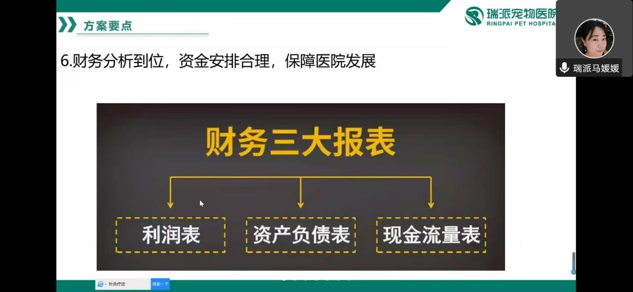 作为本次培训的主讲人,媛媛女士首先向参赛选手介绍了宠物诊疗行业的发展历史,宠物医疗市场规模,宠物医疗产业链关系,战略思维以及全国各地的竞争状况。接着介绍了瑞派公司的成长历史,公司的运营理念以及人才培养计划。全方位向同学们展示了瑞派的经营模式,言辞恳切真诚,赢得了同学们的热烈掌声
