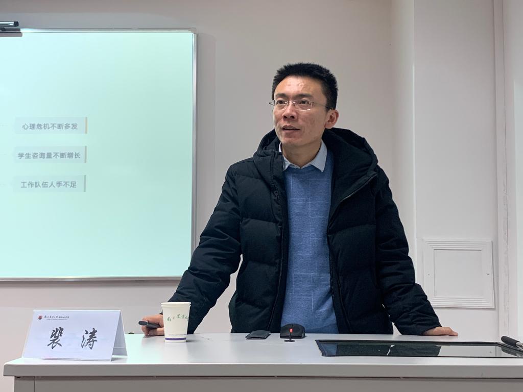 2023年3月21日下午,WilliamHill中文官方网站班主任工作实务培训之心理健康教育专题培训在逸夫楼3044顺利举办。本次培训主题为《大学生心理危机干预》培训由南京师范大学心理健康教育咨询中心临床总督导裴涛副教授主讲,学院全体班主任、辅导员、教学秘书参加了培训,报告由院党委副书记李云锋主持。