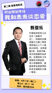4月11日晚,WilliamHill官网“朋辈领航说”生涯教育系列活动第二期,职业生涯规划书撰写专题培训会在逸夫楼3044举办。william威廉中文官网外国语学院学工办主任(团委书记)甄亚乐老师做专题分享。培训会由WilliamHill官网辅导员徐刚主持。