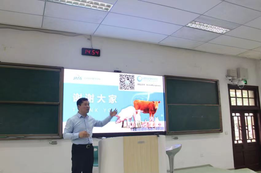 冯志新研究员以“以支原体为例谈动物疫情诊断与防控技术进展”为主题,用一系列畜牧养殖业的相关数据阐述动物医学及动物药学专业在我国畜牧行业中的重要地位,并结合自己的研究经历及一些生动形象的视频资料向同学们讲述了动物诊断产品以及动物疫苗的研究现状与未来发展走向。冯志新表示,动物诊断产品应做到像超市售卖商品那样,实现在家也能诊断,动物疫苗在未来将朝着大群化、无针化、技术通用性方面发展。