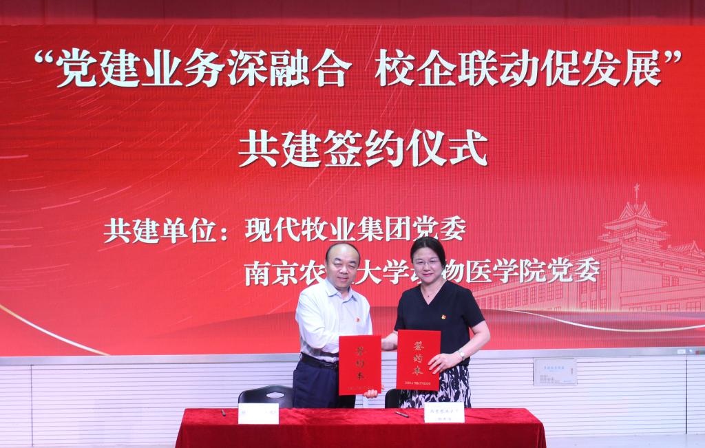 会上举行了“党建业务深融合 校企联动促发展”共建签约仪式,郭文举和姜岩代表现代牧业集团党委和动物医学院党委签署共建协议。