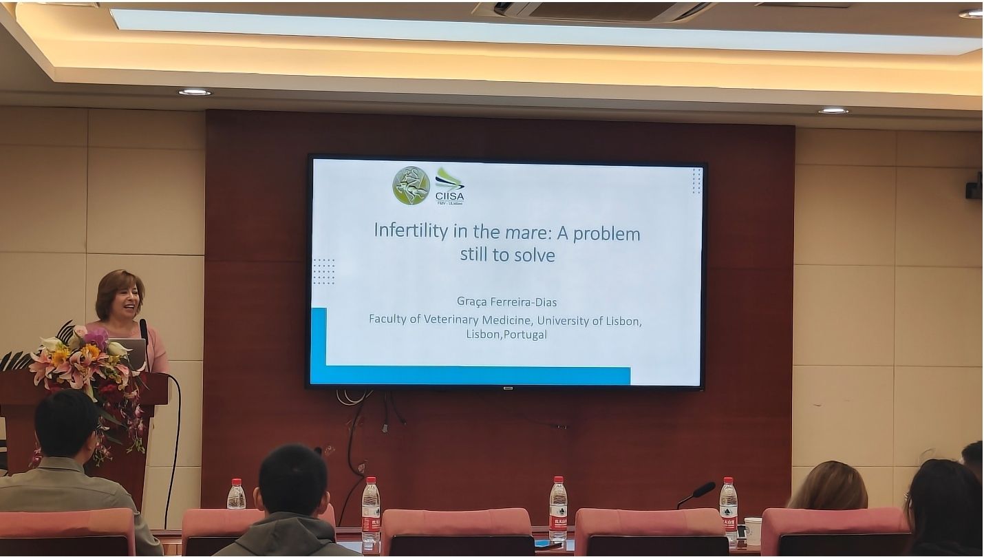 10月14日上午,Ferreira-Dias教授为师生做了题为“Infertility in the mare: A problem still to solve”的精彩报告,深入讲解了引起马繁殖障碍的主要病因及发病机制方面的最新研究进展,并详细介绍了马繁殖障碍性疾病诊疗方面的最新研究成果。Ferreira-Dias教授、Athina Basioura教授和与会师生积极互动交流,现场讨论气氛热烈。