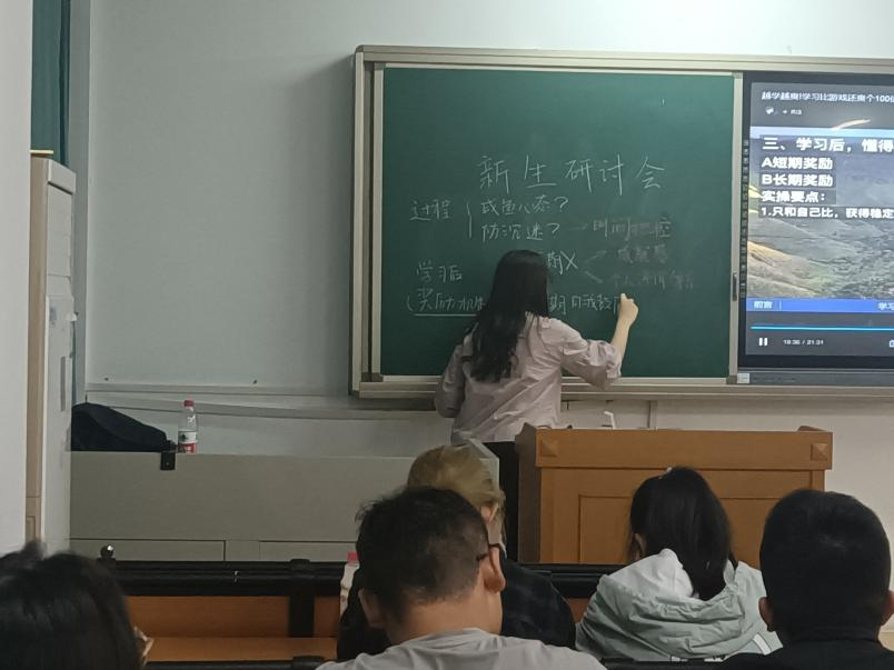 黄橙玥从过去一年的学习及生活经验出发,展开以“遵循自己的钟,做不后悔的选择”为主题的交流分享。她以视频为导入,手写板书,梳理框架,详细地向大家分享了自己的学习方法、信息的检索与利用方法,以及情绪的管理三方面的内容。在整个研讨课过程中,她以22级优秀学姐的身份进行分享、解惑,鼓励并助力同学们更好地适应大学的生活。