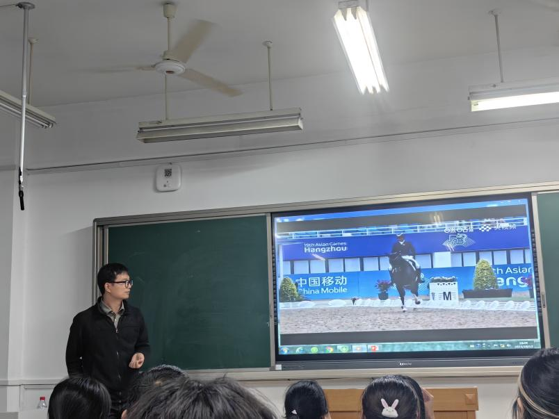 王炜晗以“马术运动与现代马匹医疗”为主题展开此次新生研讨课。他以个人经历引入,通过视频介绍了广义和狭义上的马术运动,并以此引出了现代马匹医疗。他介绍了马匹易损伤的部位、损伤诊断方法以及现代马医疗的目的,并以亚运会为例展现了对马匹福利的重视。研讨课上,同学们了解了兽医在疾病治疗、马匹运输、衔铁和装备检查等方面的重要作用,加深了对马匹医疗的认识。