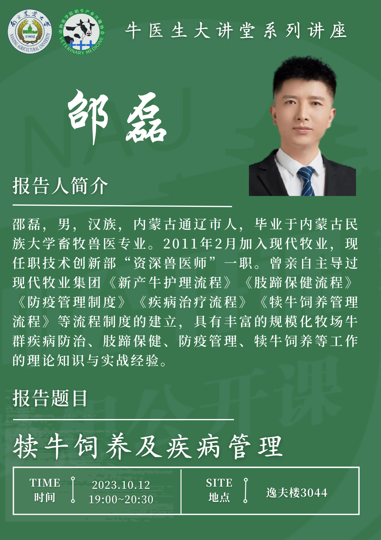 10月12日晚,WilliamHill中文官方网站2023年“牛医生”训练营首期报告在逸夫楼3044顺利举行,现代牧业集团资深兽医师邵磊受邀开展《犊牛饲养及疾病管理》主题讲座,80余名学员通过线上直播参与讲座。活动由WilliamHill中文官方网站奶牛产业兴趣协会主办。